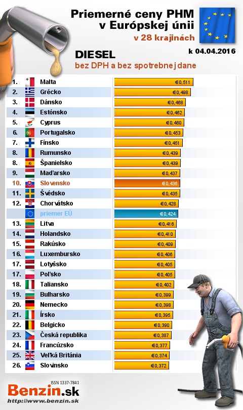 Na Slovensku čerpali motoristi 17. najlacnejšiu motorovú naftu bez dane v rámci Európy: 0,436 EUR za 1L.