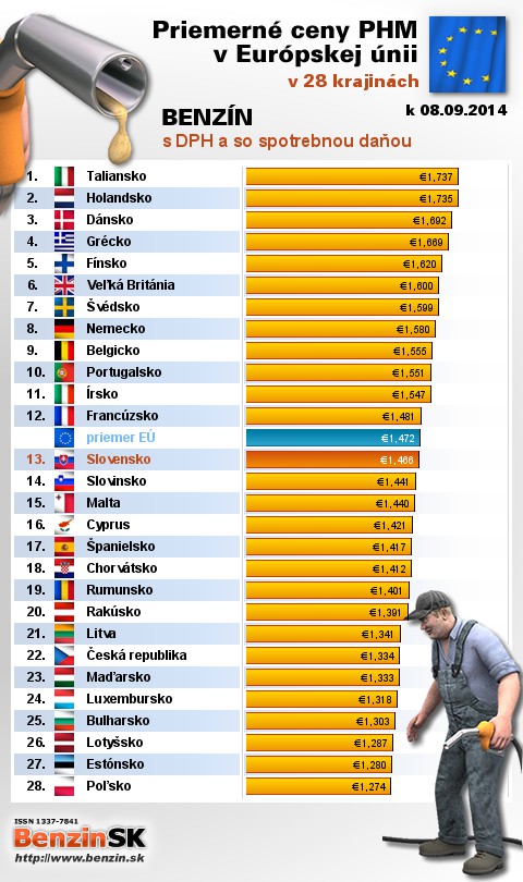 Na Slovensku sme tankovali 13. najdrahší benzín s daňou v EÚ za priemernú cenu: 1,466 EUR za 1L.