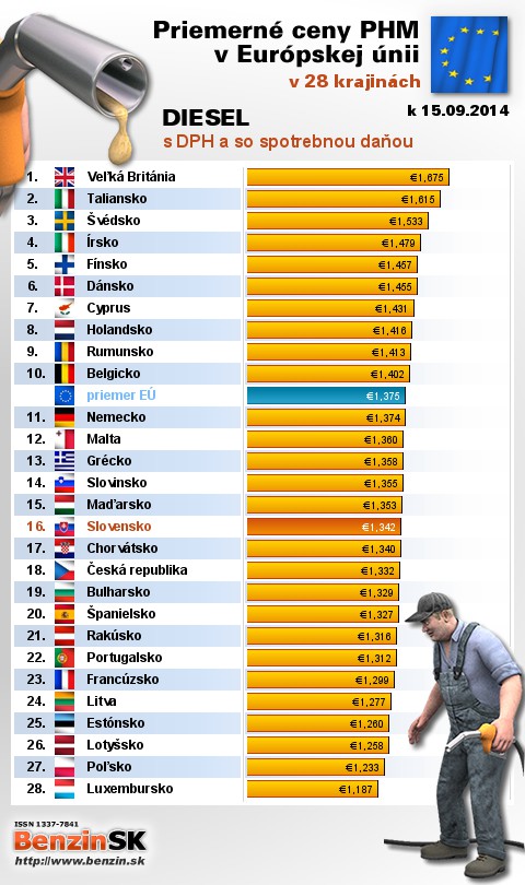 Na Slovensku čerpali motoristi 16. najdrahšiu motorovú naftu s daňou v rámci Európy: 1,342 EUR za 1L.